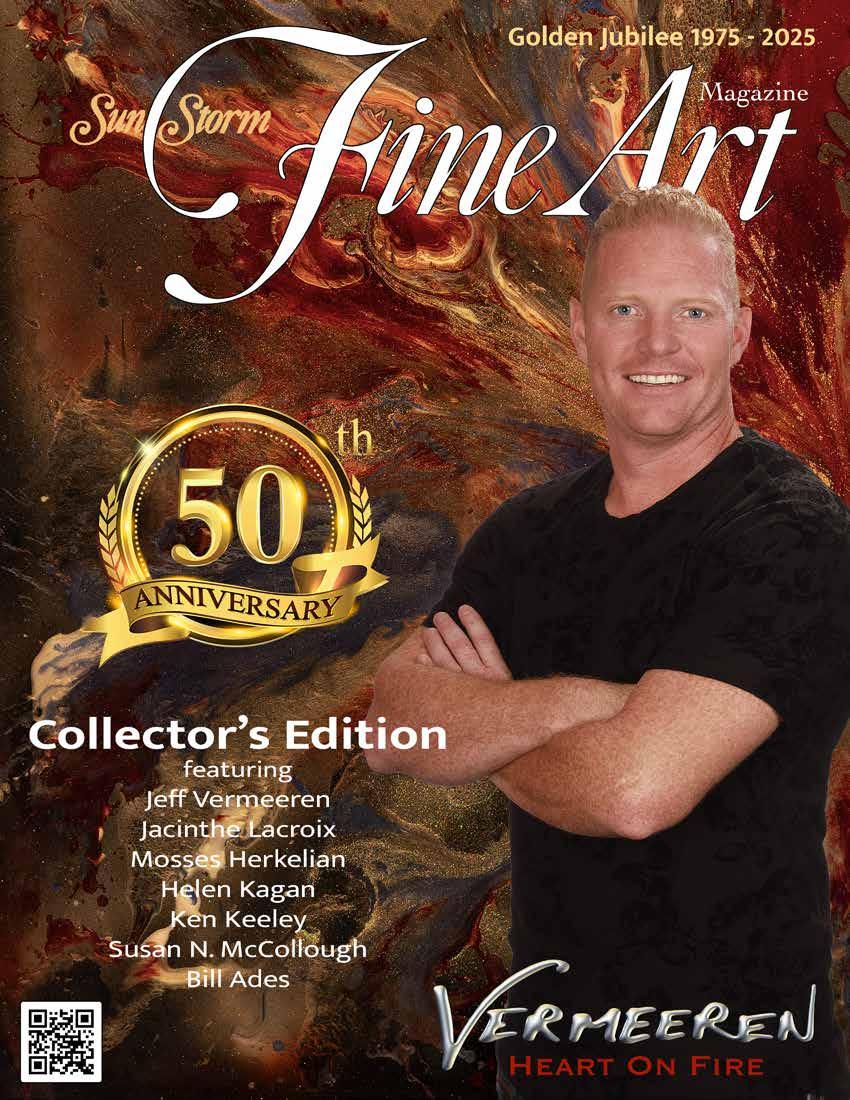 Jeff Vermeeren is a delight to have known over the last decade as we have watched him develop and create art for collectors, making impressive wall works available to the public. Until now, wall space for the most part was reserved for canvas, paper, reliefs and/or wall-hangings in traditional mediums. Jeff’s technique has advanced to encompass both figurative and abstract spaces with instilled vitality and sensation. This new mode of expression Jeff has created dominates the visual presentation of each piece with color, fire and excitement. Displayed in Jeff’s artistic process is an inventiveness — the ray of light issued from the artist’s heart intended to inspire and enlighten. Capturing energy and movement, the possibilities of dimensionality offered by his galvanizing work has resulted in broad-spectrum appeal of his paintings and sculptures to collectors. In the overview to the images in the SunStorm FINE ART’s 50th Anniversary Edition, you will see crowds react with enthusiasm to his presence and works in all venues. On board cruise ships, at auctions, and during galley events the people are happy and engaged. With his natural convivial availability, one can see the work is infused with his personal presence, not a distant brooding artistic force. His joy becomes evident in his images up close and personal. Maybe the reader can tell I am a big fan of Jeff Vermeeren — as an artist and as a person.