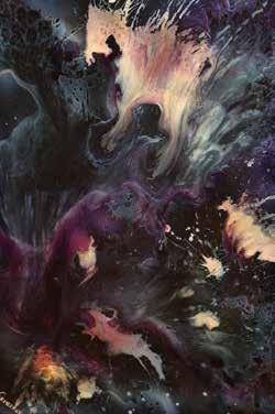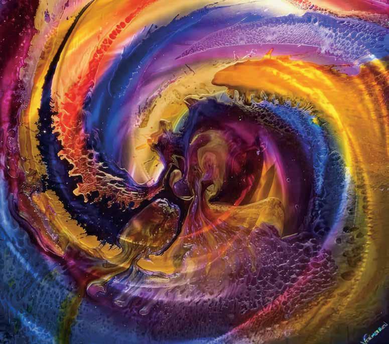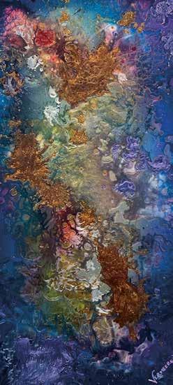 In a world of creatives and influencers fighting for a fleeting moment of attention, Jeff Vermeeren’s paintings jump off the wall. The light and energy are impossible to ignore. There is a power in them. The beauty of a Vermeeren is that you can spend a quick few seconds absorbing the immediate visual impact or an infinite number of years gleaning and mining the depth of his visions. Deep yet decorative, Vermeeren has something people want — a story in every work. Some are obvious, some require one’s full attention and all provide a deep glimpse into not only the soul of an artist but into elements of wordless splendor. As a sculptor finds form in wood and stone, Vermeeren takes fire and water that he somehow solidifies onto a canvas of metal that reflects as well as portrays a pristine energy that unmistakably brings about a more perfect world. “A swirling whorl of nebulae,” said one pundit. “The fruits of Jeff’s labor.”