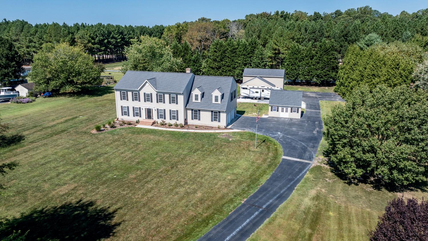This 21.59-acre property features a Southern Colonial home with 5 bedrooms and 3.5 baths. The kitchen boasts granite countertops and modern appliances, and a sunroom overlooks the Eastern Shore wildlife. The second floor includes 4 bedrooms and a primary suite with an ensuite bath and 2 walk-in closets. Outdoors, enjoy a pool with a spacious deck. Additional amenities include a detached 4-car garage with a workshop and 8,000 lb lift, a 2018 custom pole barn with a finished gathering room and bar, and a horse pasture. Recent upgrades include a new roof, HVAC, windows, and solar panels. The property offers both tranquility and convenient access to Easton and Cambridge.