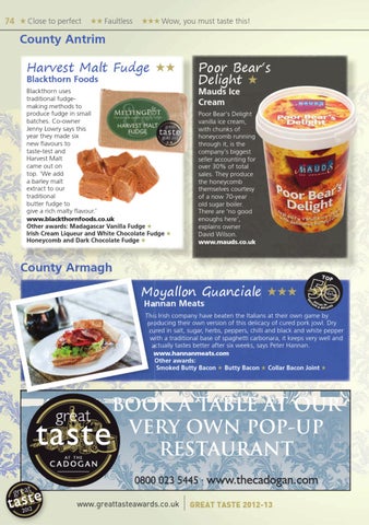 Blackthorn uses traditional fudgemaking methods to produce fudge in small batches. Co-owner Jenny Lowry says this year they made six new flavours to taste-test and Harvest Malt came out on top. ‘We add a barley malt extract to our traditional butter fudge to give a rich malty flavour.’ www.blackthornfoods.co.uk Other awards: Madagascar Vanilla Fudge ★ Irish Cream Liqueur and White Chocolate Fudge ★ Honeycomb and Dark Chocolate Fudge ★
