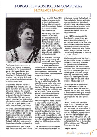family holiday house at Healesville with her 2 sons and adopted daughter and insisted on a deed of separation. Her husband refused, but wrote asking for a divorce by mutual consent. Florence refused, and in the following year she relocated to East Melbourne with the boys but she was placed in a convent. In April 1924 Florence composed five ‘Bush Songs’ for voice and piano which were performed later that year twice in Melbourne and once in London. Then while her husband was overseas she delivered their adopted daughter to her guardians. Despite this upsetting him, when Florence travelled to Italy in October to study with Ottorino Respighi he paid her an allowance of 6 pounds per week. After being abroad for more than 4 years she learnt that her husband had petitioned for divorce on the grounds of desertion. She returned to Melbourne where the case was heard in the Civil Court during September, 1929. Her main defence that she had done nothing wrong and should not be subjected to divorce at her age did not stop her husband being granted a decree nisi, but through his solicitors he agreed to pay her court costs and an allowance of 5 pounds per week. Her composing was not affected as in 1930 she wrote a string quartet that was performed twice in Melbourne, and completed the 3-act opera ‘The Courtship of Miles Standish’ that was given a concert performance at the Melbourne University Conservatorium in May of the following year. Living in a cottage in the Dandenong ranges, Florence completed the operas ‘Matteo Falcone’ and ‘Nala Wooing’ in 1933, and in 1934 took her four operas to England hoping for performances. Nothing came of it. Undeterred, Florence returned to Melbourne and completed the opera ‘Pepita’s Miracle’ in November, 1945. But time was running out, and when she died in her home at South Yarra on 9th November, 1945 the unfinished opera ‘A Game of Chess’ was on her desk. - Stephen Pleskun March 2017