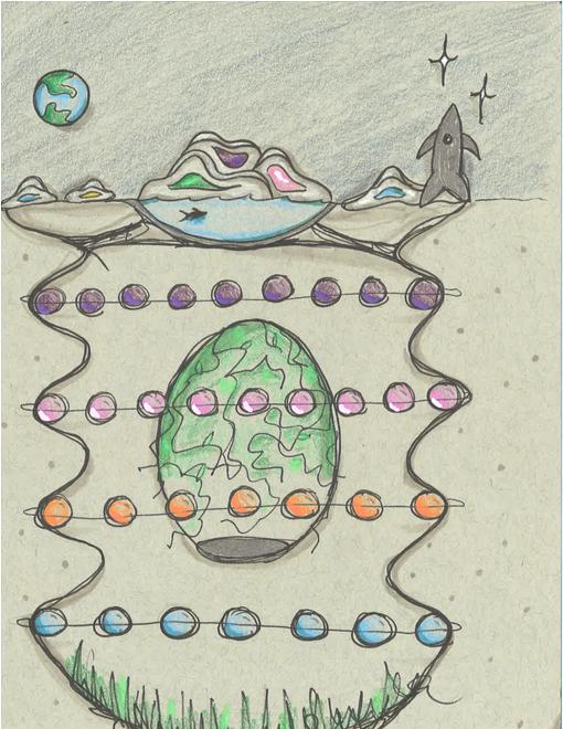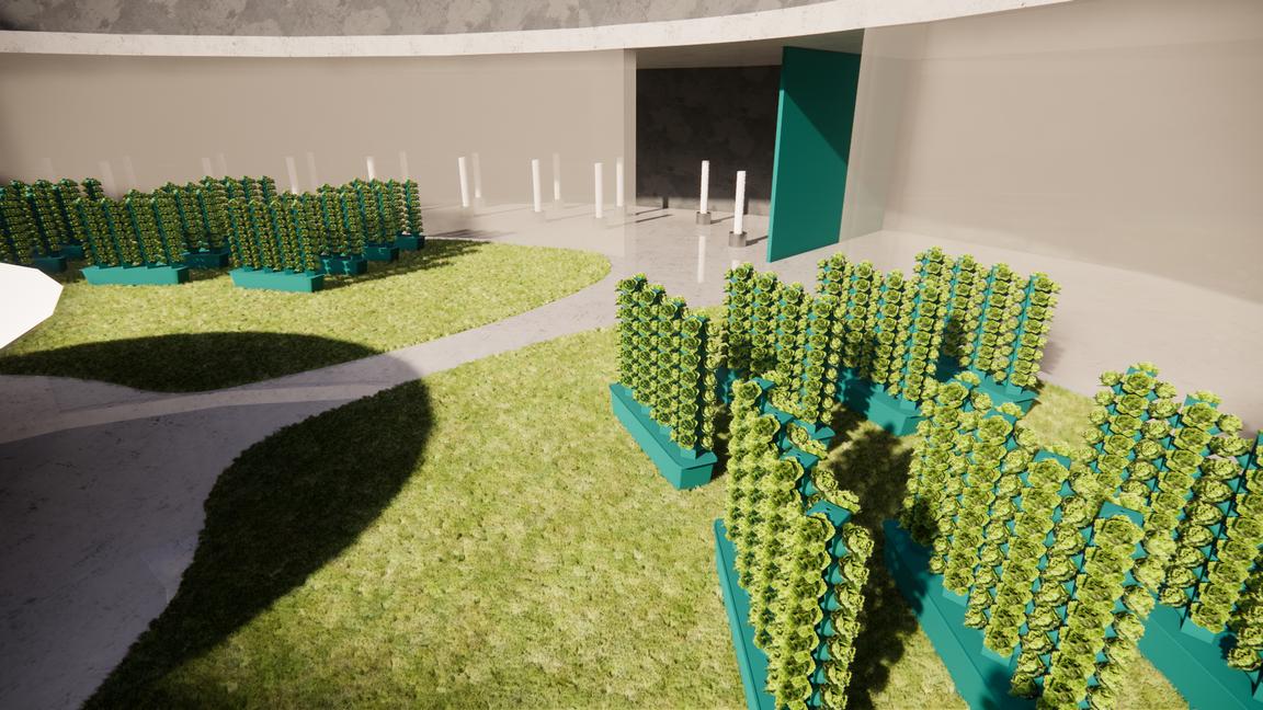a space for the pumps for the water of the tank. The water tank holds fish which are used to feed the people staying in Neoma. This is an aquaponics structure and there is a layer of vegetation on top of the water tank. The roots of the plants help provide nutrients for the fish and help clean the water. The plants grown also provide food for the people occupying Neoma and can be harvested from the various patches on the sides of the core.