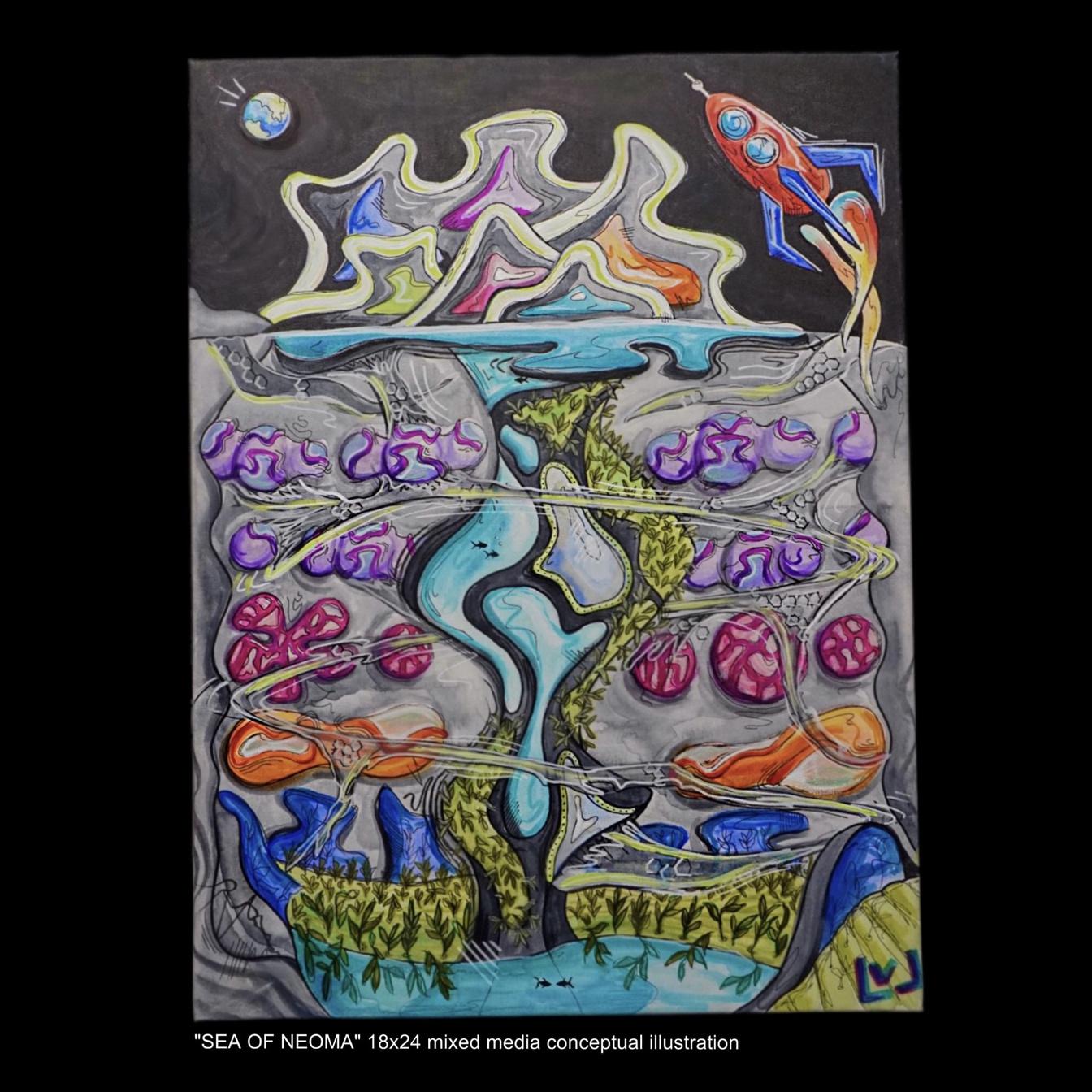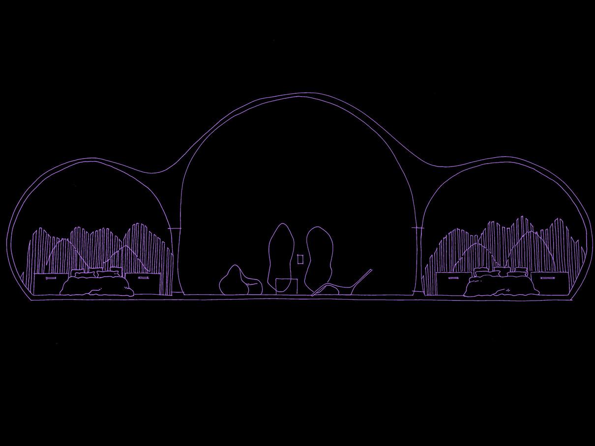 The shape of these pods was chosen to be ovular and furniture arranged inside of them in a way that represents a cell. This cellular shape represents the building blocks of life and reminds us of our human existence on the moon and how science and research help us better understand ourselves. It also is what drives us to be and powers our bodies. Just how this level of the Neoma powers and helps expand our knowledge of the moon and how we can live in harmony on it.