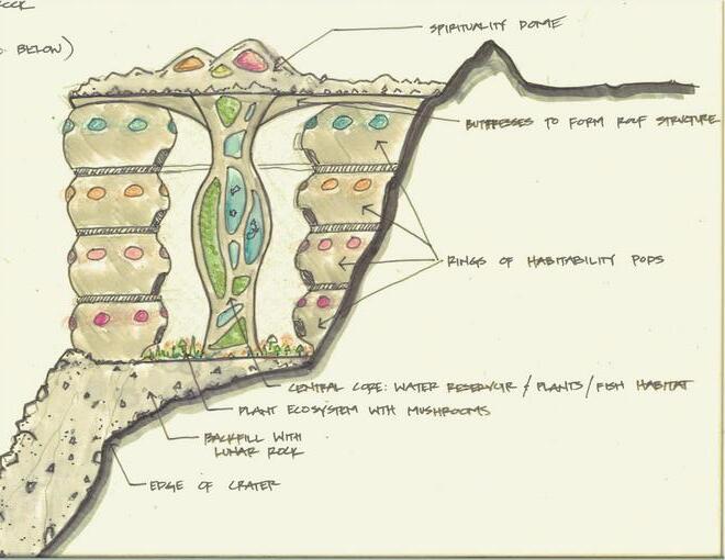 The intent of this project is to break away from the design norms of Earth in a daring yet practical fashion Thus, creating a fully functional space in an uninhabitable environment This project promotes breaking-edge scientific research on the moon while simultaneously preserving its inhabitants' mental, spiritual, and physical lives. The designers used resources from the moon and the best design to promote productivity and self-sufficiency in space