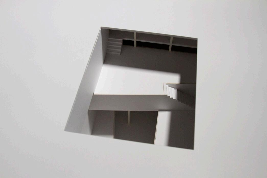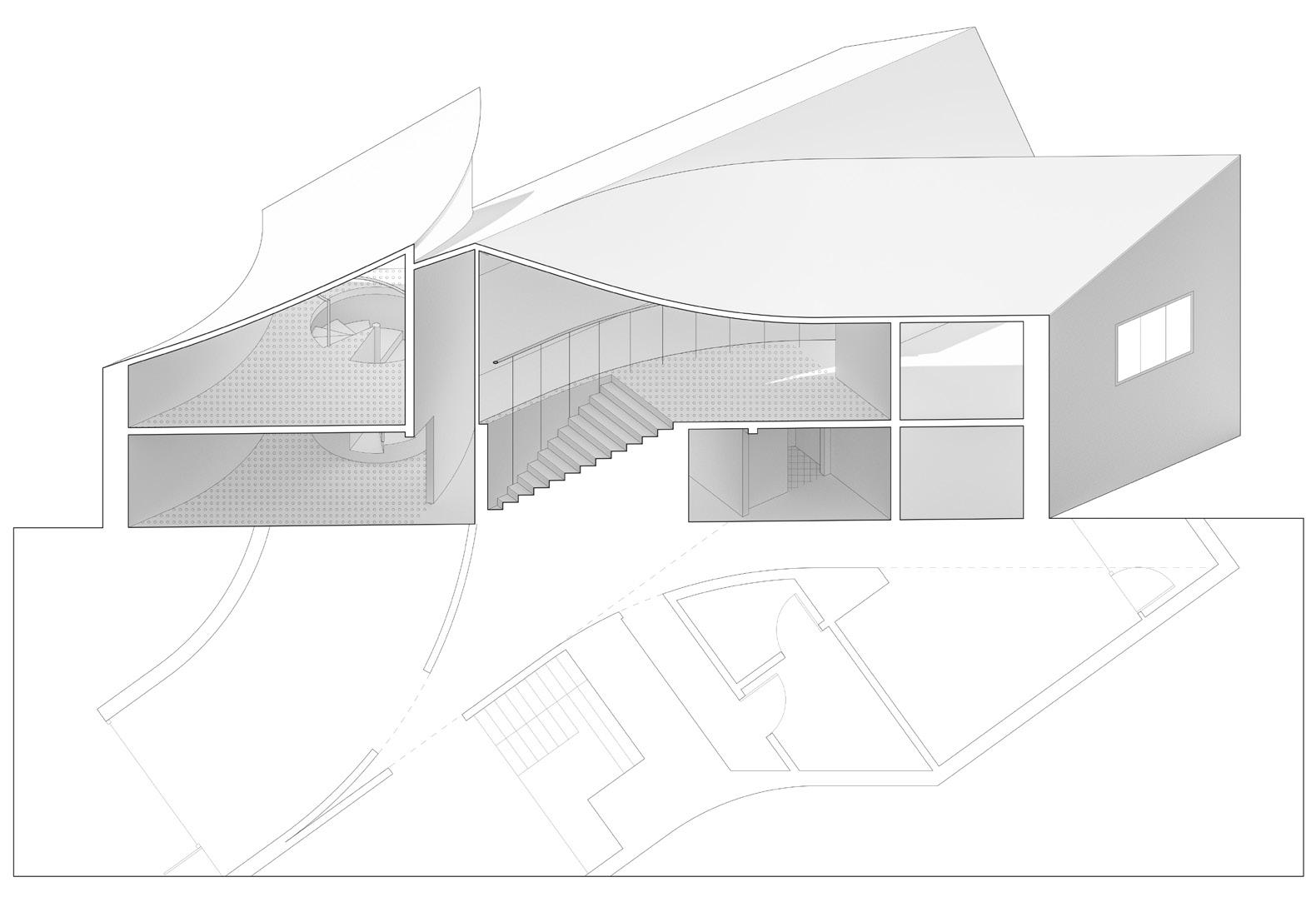 When one form is pushed through the other, it drags the other with it. This operation generates a fillet at the corner that takes the form of an arc; a segment of a circle. The tangents of these circles connect the roof lines and are used as generative tools for interior division.