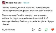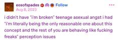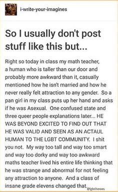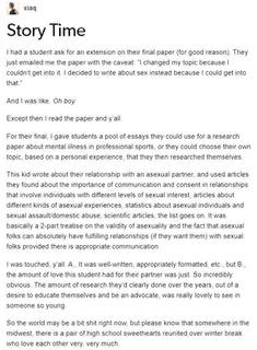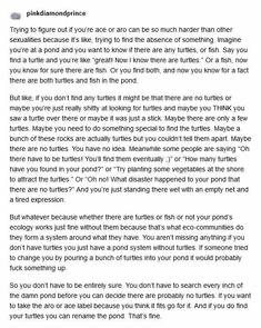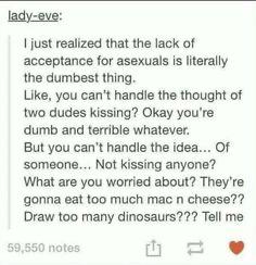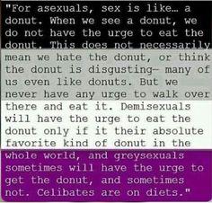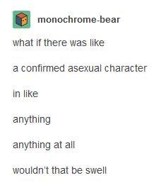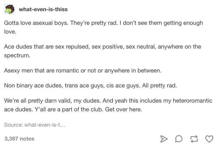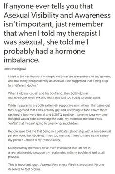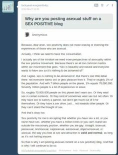 I have also included a section of (mostly) Tumblr posts that showcase the wide variety of experiences asexual people face. I thought Tumblr was a fitting medium as many people have gone to Tumblr over the years for help determining their identity. I also think that it’s important to show the many sides of asexuality, as it’s not just “not having sex”. Asexual people have created a wonderful community, and also face oppression that is often glossed over as well as discussions of asexuality in general. Asexual people are also known for their humor, so I thought it would be fun to include some of that as well.