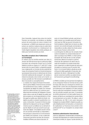 outre, le Conseil fédéral souhaite, avec le bac à Dans l’ensemble, s’agissant des acteurs du marché sable, trouver une nouvelle source de financefinancier non autorisés, une tendance au dévelopment pour les PME qui peuvent rémunérer les pement de constructions de nature à éluder la loi fonds acceptés en dépôt dans la mesure où elles est observée. La FINMA lutte résolument contre ces exercent une activité principale commerciale ou acteurs du marché et ordonne dans le cadre de la industrielle et où elles utilisent les fonds exclusiprocédure d’enforcement en rétablissement de vement pour financer cette activité. l’ordre légal la liquidation des entités juridiques uti– La prolongation du délai pour les comptes d’exélisées pour l’activité exercée sans droit. cution (« exception du compte d’exécution »)27 : Nouvelles exceptions dans l’ordonnance selon la pratique de la FINMA, il n’était permis sur les banques d’accepter des fonds de tiers sur des comptes En relation avec les activités exercées sans droit, la d’exécution détenus en propre et, partant, révision de l’OB intervenue dans le cadre de la régled’exécuter des opérations de clients dans le mentation des entreprises Fintech par le Conseil cadre de l’exception du compte d’exécution fédéral et entrée en vigueur le 1er août 2017 a égaqu’en respectant un délai de garde de sept jours ouvrables au maximum pour le transfert des lement été d’un grand intérêt. Le dispositif proposé fonds. Or, le Conseil fédéral a décidé de porter vise à réglementer, en fonction de leur potentiel de à 60 jours le délai applicable à l’exécution des risque, les entreprises Fintech et d’autres entreprises opérations de clients. L’allongement du délai qui proposent des services ne relevant pas du champ 25 devrait notamment profiter aux plates-formes d’activité traditionnel des banques , de manière à de financement participatif (crowdfunding). réduire les obstacles à leur entrée sur le marché. La révision partielle de l’OB introduit essentiellement La FINMA considère qu’il est pertinent de réglemendeux nouveautés ou assouplissements : ter les entreprises Fintech en fonction de leur profil – La création d’un espace favorisant l’innovation de risque. Elle salue par conséquent la révision pardans la partie dédiée à l’exercice d’une activité à tielle de l’OB. L’avenir dira si les dispositions révisées titre professionnel (« bac à sable », sandbox)26 : de l’ordonnance sont adaptées sur le plan pratique. l’acceptation de dépôts du public d’un montant Dans le cadre des investigations menées en relation total d’un million de francs au maximum peut avec les activités exercées sans droit, il conviendra désormais être exonérée de l’obligation d’autoride vérifier précisément si et dans quelle mesure cet sation même si plus de 20 dépôts du public sont espace de liberté est revendiqué de manière illicite ainsi acceptés sur une longue période ou s’il est ou contrairement au but prévu. Par ailleurs, suite à fait appel au public pour obtenir les fonds. Les la modification de l’OB, il s’est avéré nécessaire dépôts du public ne doivent toutefois être ni ind’adapter la circulaire 2008/3 « Dépôts du public auvestis ni rémunérés. Il convient d’informer préaprès d’établissements non bancaires », et notamment lablement les déposants du fait que la FINMA les explications sur l’exercice d’une activité à titre n’exerce aucune surveillance sur ce domaine et professionnel28 et sur l’exception du compte d’exéque les dépôts ne sont pas couverts par la garantie des dépôts. Si les dépôts servent à financution29. cer une activité commerciale ou industrielle à titre principal, le placement et la rémunération Assistance administrative internationale par intérêts sont autorisés. Le bac à sable doit Suite aux adaptations fondamentales introduites par notamment permettre de tester de nouveaux la révision des dispositions en matière d’assistance admodèles d’affaires sans licence bancaire. En ministrative entrées en vigueur l’année dernière, la
