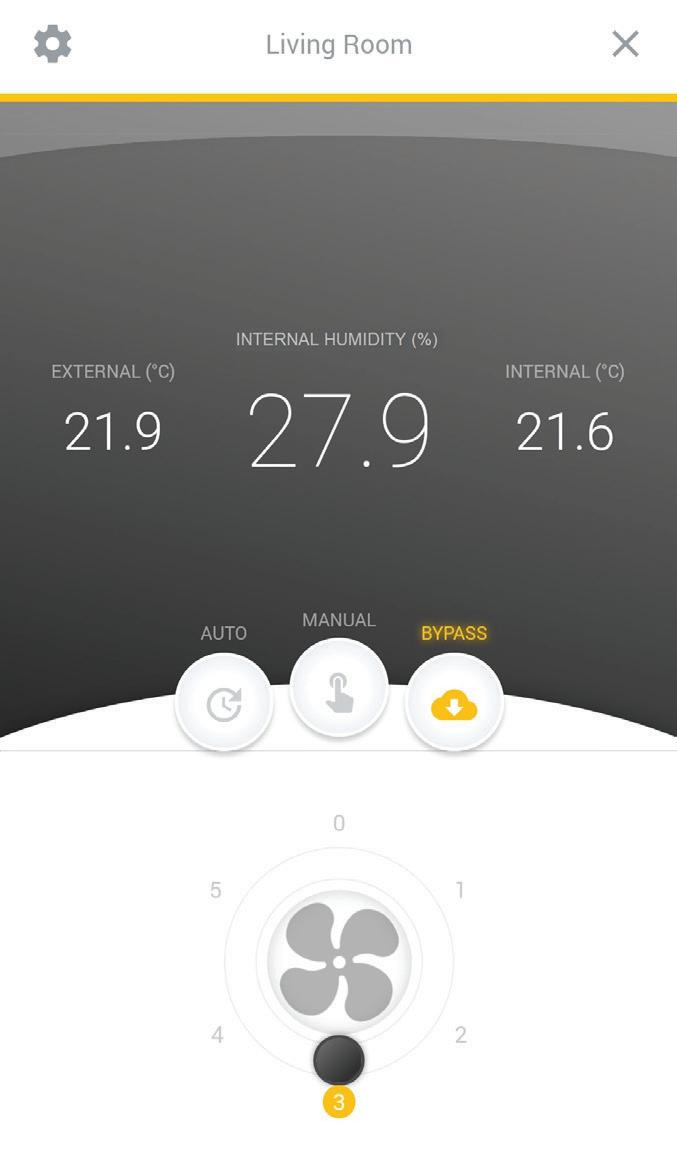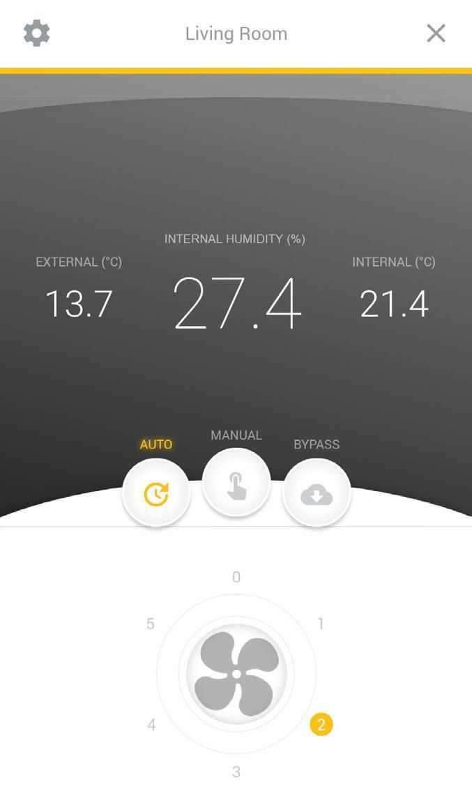 In het hoofdvenster van de betreffende ActiveVent ziet u niet alleen de buitenen binnentemperatuur en de luchtvochtigheid in de ruimte. U kunt ook meteen de modi en de snelheid van de ActiveVent instellen.