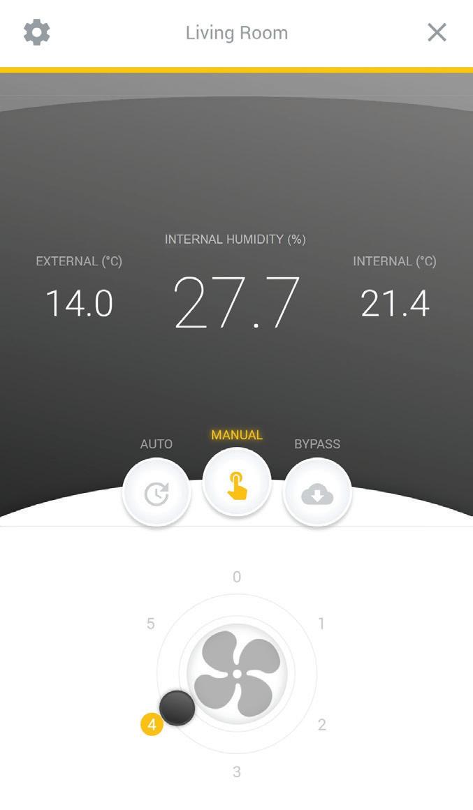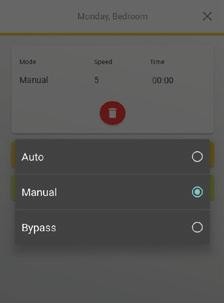 In de modus “Handmatig” kunt u het apparaat zelf bedienen via de app. U kunt daarbij de snelheid instellen van niveau 0 (OFF) tot 5 door aan de cursor te draaien. Op de volgende afbeelding heeft de gebruiker het apparaat ingesteld op niveau 4.