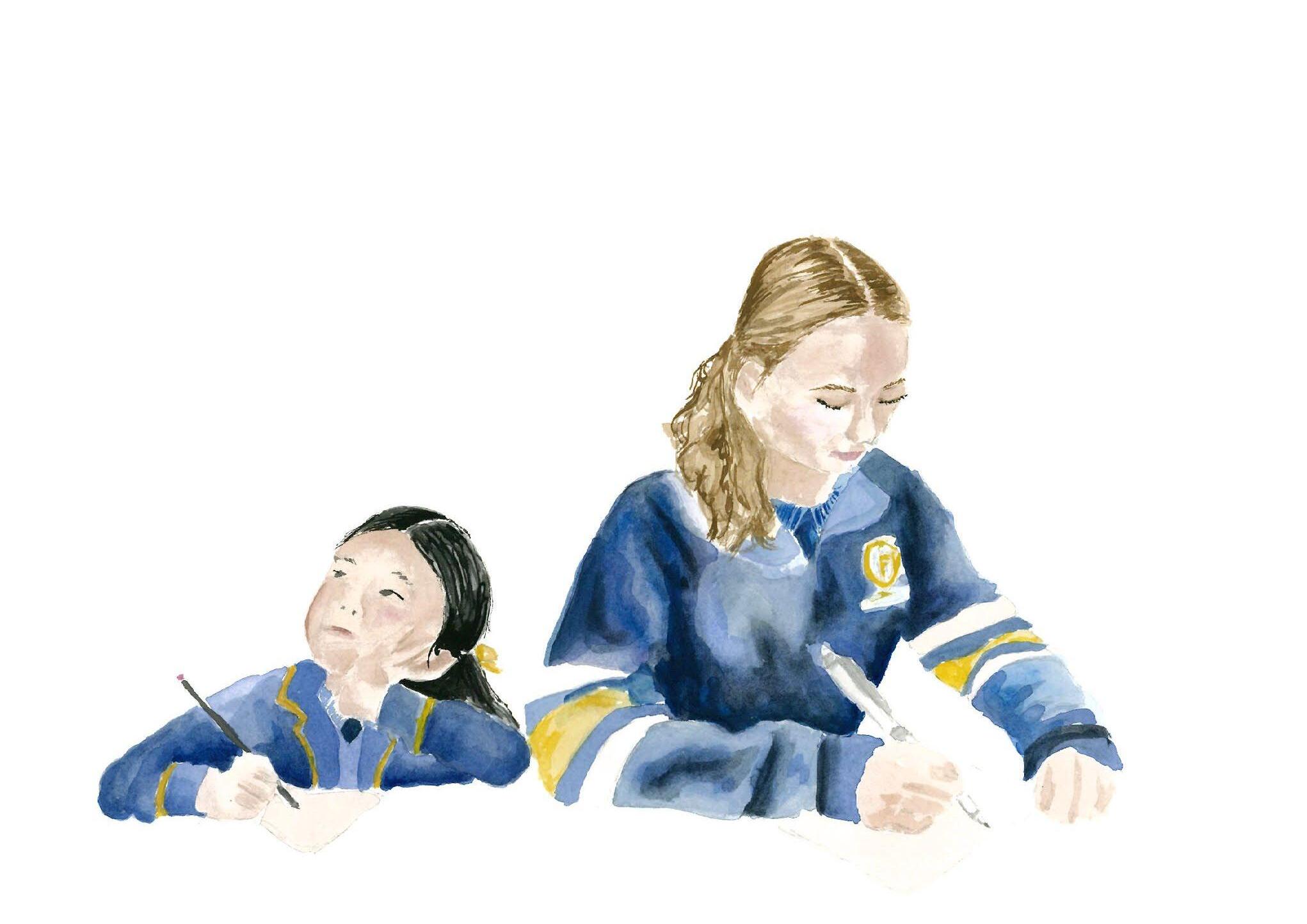 Alongside the written pieces, this anthology also features an impressive collection of student artwork. These visual stories enhance the reading experience, each one offering its own interpretation and emotional depth. The cover, designed by Zindzi Clayford (Year 12 Art Captain), captures the essence of this creative journey—depicting a younger and older student sitting together, each absorbed in the act of writing, connected across age and experience through the shared power of storytelling.