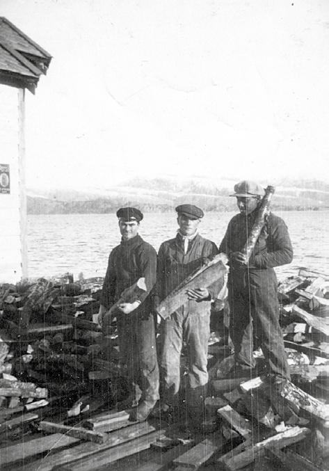 Det er vinter i Solund. På Innerøy-kaia har ein båt lempa på land ein heil haug med trevirke som skal bli til fyringsved. Vi legg merke til kolbua til venstre på biletet. Denne hadde to rom, eit for kol og eit for tareoske. Av dei tre karane som ber vekk veden, kjenner vi att Sverre Berntsen til venstre. Dei to andre er ukjende. Biletet er henta frå Solundarkivet.