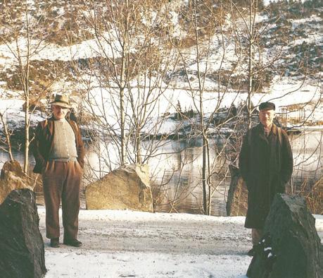 To eldre karar på tur ein vinterdag i Hyllestad i slutten av 1960-åra. Til venstre ser vi Johan Bø som var småbrukar og dreiv fehandel og fiske i tillegg. På folkemunne vart han kalla for «Løven». Den andre, Edvard Løvås, var småbrukar i Lønebotnen og arbeidde elles som gartnar hjå Døscher i Leirvik. Her har dei nok vore nedom Leirvik på handel. Biletet er henta frå ”Hyllestad 1861-2011”.