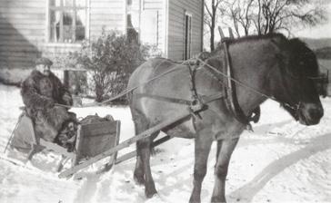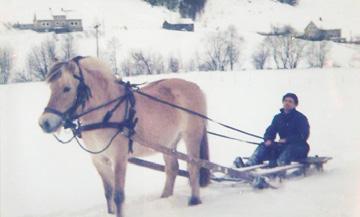 Her er eit lite typisk vinterbilete frå Gulen frå 1970åra. Hesten fanst framleis som trekkdyr på mange gardar. Her har Ivar Sjursen Haugland, betre kjend lokalt som ”Sjurivaren”, spent hesten Andrea føre sle den ein vinterdag. Eigar: Brynjar Takle.