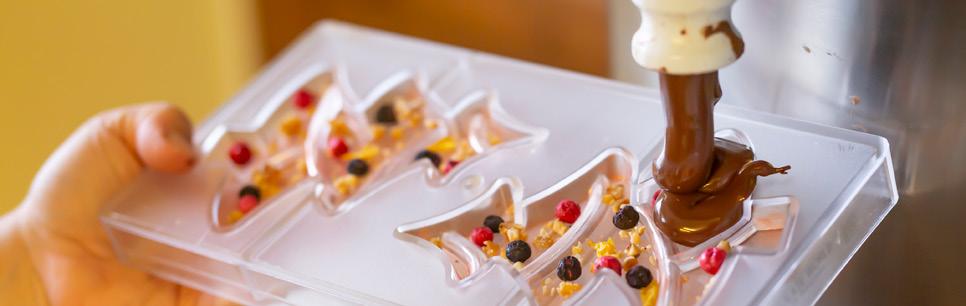 Når formene er ferdig dekorerte blir det heile dekka med rennande sjokolade. Den overskytande sjokoladen blir deretter teke bort før forma blir sett inn i tørkemaskina.