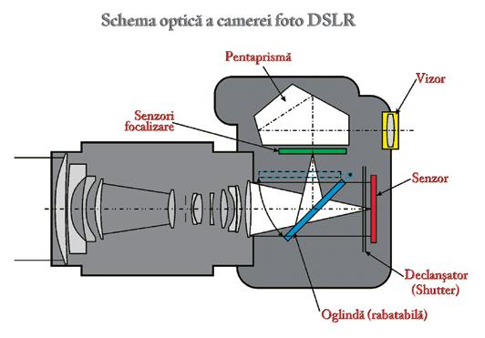 oglindă interpusă temporar între obiectiv ş vizor) cât şi abilitatea de a schimba/ înlocui obiectivele foto (pentru o mai bună adaptare la diversele situaţii fotografice).