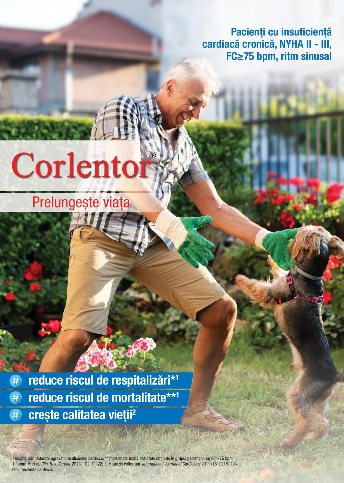 Denumirea comercială a medicamentului: Corlentor 5 mg comprimate filmate. Corlentor 7,5 mg comprimate filmate. Compoziția calitativă și cantitativă*: Corlentor 5 mg: un comprimat filmat conține ivabradină 5 mg (echivalent cu clorhidrat de ivabradină 5,390 mg). Excipient cu efect cunoscut: lactoză monohidrat 63,91 mg. Corlentor 7,5 mg: un comprimat filmat conține ivabradină 7,5 mg (echivalent cu clorhidrat de ivabradină 8,085 mg). Excipient cu efect cunoscut: lactoză monohidrat 61,215 mg. Forma farmaceutică: Comprimate filmate. Corlentor 5 mg: comprimate filmate ovale, de culoarea somonului, cu șanț de divizare pe ambele fețe, gravate pe una dintre fețe cu „5”, iar pe cealaltă față cu semnul . Comprimatul poate fi divizat în doze egale. Corlentor 7,5 mg: comprimate filmate triunghiulare, de culoarea somonului, gravate pe una dintre fețe cu „7,5”, iar pe cealaltă față cu semnul . Indicații terapeutice: Tratamentul simptomatic al anginei pectorale cronice stabile: Ivabradina este indicată pentru tratamentul simptomatic al anginei pectorale cronice stabile la adulți cu boală coronariană și ritm sinusal normal și frecvență cardiacă ≥70 bpm. Ivabradina este indicată: la adulți care au intoleranță sau contraindicație la beta-blocante; în asociere cu beta-blocante la pacienți insuficient controlați cu o doză optimă de beta-blocant. Tratamentul insuficienței cardiace cronice: Ivabradina este indicată în insuficiența cardiacă cronică clasa II-IV NYHA cu disfuncție sistolică, la pacienți în ritm sinusal și a căror frecvență cardiacă este ≥75 bpm, în asociere cu terapia standard incluzând beta-blocante sau atunci când tratamentul cu beta-blocante este contraindicat sau nu este tolerat. Doze și mod de administrare*: Tratamentul simptomatic al anginei pectorale cronice stabile: Doza de inițiere nu trebuie să depășească 5 mg ivabradină de două ori pe zi la pacienții cu vârsta sub 75 ani. După trei-patru săptămâni de tratament, dacă pacientul este încă simptomatic, în cazul în care doza inițială este bine tolerată și frecvența cardiacă în repaus se menține peste 60 bpm, doza poate fi crescută până la următoarea doză mai mare, la pacienții care primesc 2,5 mg sau 5 mg de două ori pe zi. Doza de întreținere nu trebuie să depășească 7,5 mg de două ori pe zi. Dacă simptomele de angină pectorală nu se ameliorează în decurs de 3 luni după începerea tratamentului, tratamentul cu ivabradină trebuie întrerupt. Dacă, în timpul tratamentului, frecvența cardiacă scade sub 50 bătăi/minut (bpm) în repaus sau pacientul prezintă simptome asociate bradicardiei, cum sunt: amețeli, oboseală sau hipotensiune arterială, doza trebuie diminuată treptat, până la cea mai mică doză de 2,5 mg de două ori pe zi (o jumătate de comprimat de 5 mg de două ori pe zi). Tratamentul trebuie întrerupt în cazul în care persistă scăderea frecvenței cardiace sub 50 bpm sau simptomele de bradicardie, cu toate că doza a fost redusă. Tratamentul insuficienței cardiace cronice: Tratamentul trebuie inițiat numai la pacienții cu insuficiență cardiacă stabilă. Este recomandat ca medicul curant să aibă experiență în tratarea insuficienței cardiace cronice. De regulă, doza de inițiere recomandată este de 5 mg ivabradină de două ori pe zi. După două săptămâni de tratament, doza poate fi mărită la 7,5 mg ivabradină de două ori pe zi, dacă frecvența cardiacă se menține peste 60 bpm în repaus, sau diminuată la 2,5 mg ivabradină de două ori pe zi (o jumătate de comprimat de 5 mg de două ori pe zi), dacă frecvența cardiacă se menține sub 50 bpm în repaus sau în cazul simptomelor asociate bradicardiei, cum sunt amețeli, oboseală sau hipotensiune arterială. Dacă frecvența cardiacă este între 50 și 60 bpm, trebuie păstrată doza de 5 mg de două ori pe zi. Dacă, în timpul tratamentului, frecvența cardiacă scade persistent sub 50 bătăi pe minut (bpm) în repaus sau dacă pacientul prezintă simptome asociate bradicardiei, doza trebuie diminuată până la următoarea doză mai mică, la pacienții care primesc 7,5 mg de două ori pe zi sau 5 mg de două ori pe zi. Dacă frecvența cardiacă crește persistent peste 60 bătăi pe minut în repaus, doza poate fi crescută până la următoarea doză mai mare, la pacienții care primesc 2,5 mg de două ori pe zi sau 5 mg de două ori pe zi. Tratamentul trebuie întrerupt dacă frecvența cardiacă se menține sub 50 bpm sau dacă persistă simptomele de bradicardie. Comprimatele se administrează oral, de două ori pe zi, dimineața și seara, în timpul meselor. Contraindicații*: Hipersensibilitate la substanța activă sau la oricare dintre excipienți. Frecvența cardiacă de repaus mai mică de 70 bătăi/minut înaintea începerii tratamentului. Șoc cardiogen. Infarct miocardic acut. Hipotensiune arterială severă (<90/50 mmHg). Insuficiență hepatică severă. Sindromul sinusului bolnav. Bloc sino-atrial. Insuficiență cardiacă acută sau instabilă. Dependență de pacemaker (frecvență cardiacă impusă exclusiv de pacemaker). Angină pectorală instabilă. Bloc AV gradul 3. Asociere cu inhibitorii puternici ai citocromului P450 3A4, cum sunt: antifungice de tip azolic (ketoconazol, itraconazol), antibiotice macrolidice (claritromicină, eritromicină per os, josamicină, telitromicină), inhibitori de protează HIV (nelfinavir, ritonavir) și nefazodonă (vezi pct. Interacțiuni cu alte medicamente și alte forme de interacțiune și Proprietăți farmacocinetice). Asociere cu verapamil sau diltiazem, care sunt inhibitori moderați de CYP3A4 cu proprietăți de reducere a frecvenței cardiace (vezi pct. Interacțiuni cu alte medicamente și alte forme de interacțiune). Sarcină, alăptare și femei aflate la vârsta fertilă care nu utilizează măsuri contraceptive adecvate (vezi pct. Fert