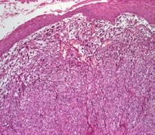 b. epiderm ulcerat, subiacent proliferare celulară malignă dispusă în fascicule, col HE x40