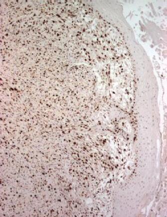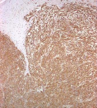a. imunomarcaj pentru vimentină, pozitiv în celulele tumorale, negativ în epiderm, x40