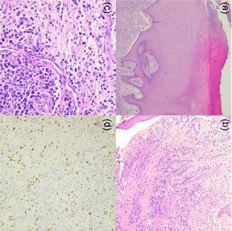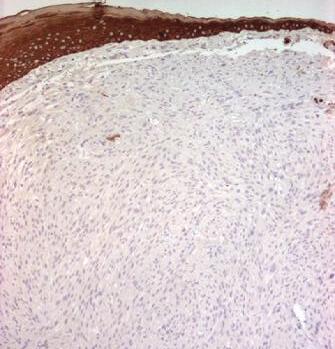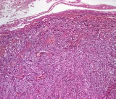 La examenul histopatologic epidermul era în general atrofic și prezenta zone ulcerate date de o proliferare celulară malignă ce ocupa dermul în totalitate. Proliferarea celulară era alcătuită din celule alungite, dispuse fascicular. Celulele prezentau nuclei ovalari, alungiţi și fusiformi, cu pleiomorfism moderat și