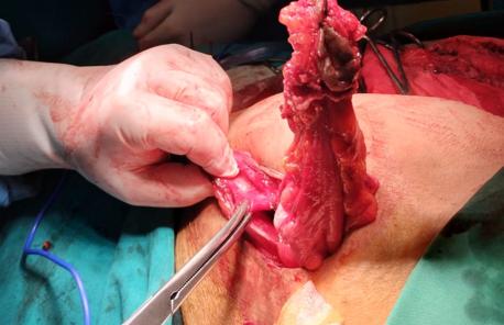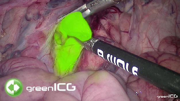 Fig 2. Ganglion santinelă împreună cu vasul aferent, vizualizate cu indocyanine green în modul green
