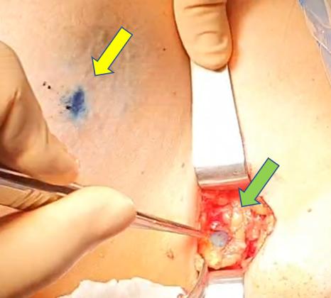Fig 3. Ganglion santinelă - săgeata verde - și locul de injectare a colorantului intradermic peritumoral – săgeata galbenă