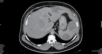 Se decide reinvestigarea prin CT toraco-abdomino-pelvin si se constată pneumoperitoneu în cantitate medie, dispus perihepatic si abdominopelvin anterior; revărsat pleural stâng ce asociază minima colabare pasivă a parenchimului adiacent.