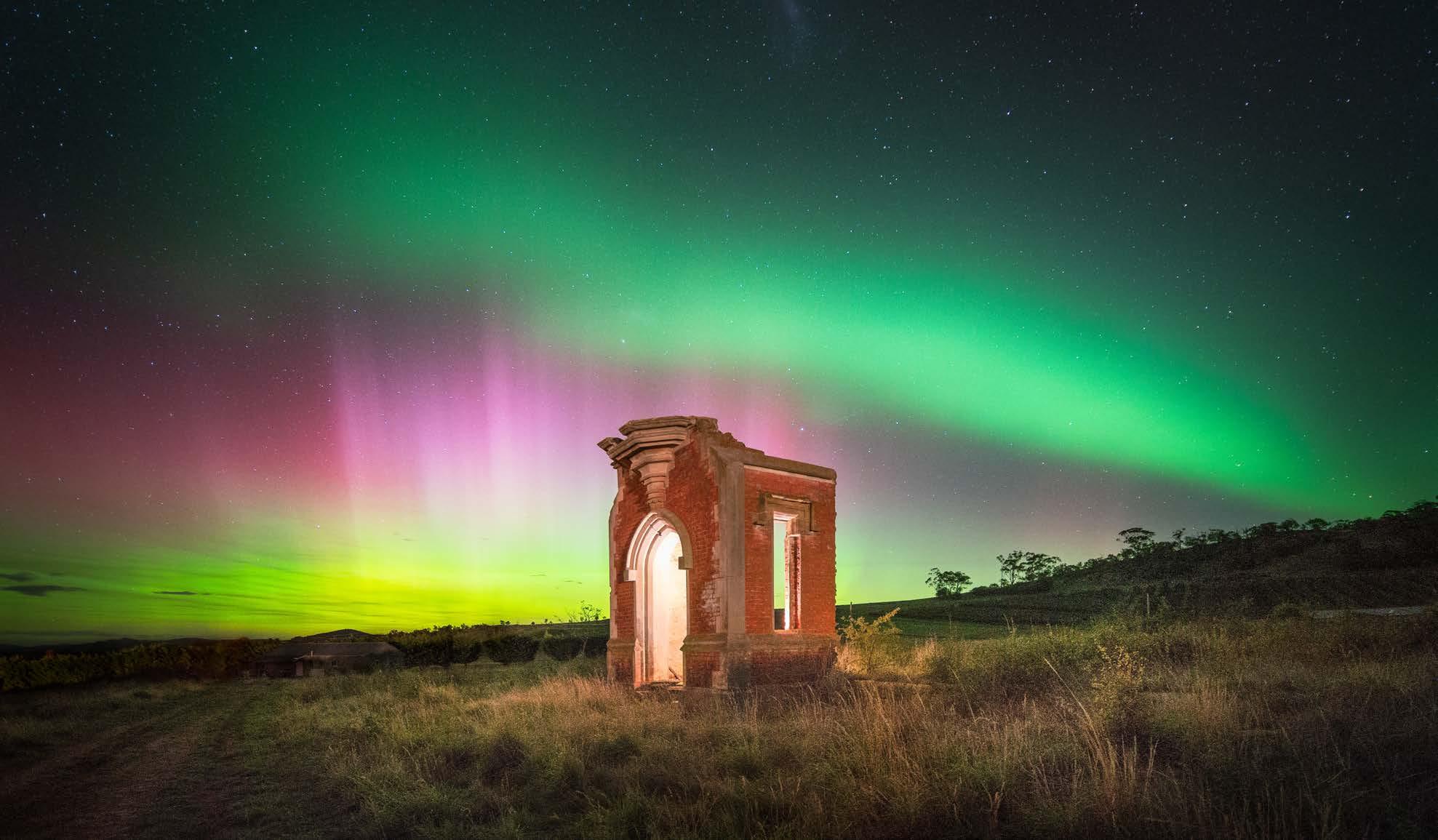 Aurora Australis over ruins of Horton Cottage. Photo Credit: Luke Tscharke.