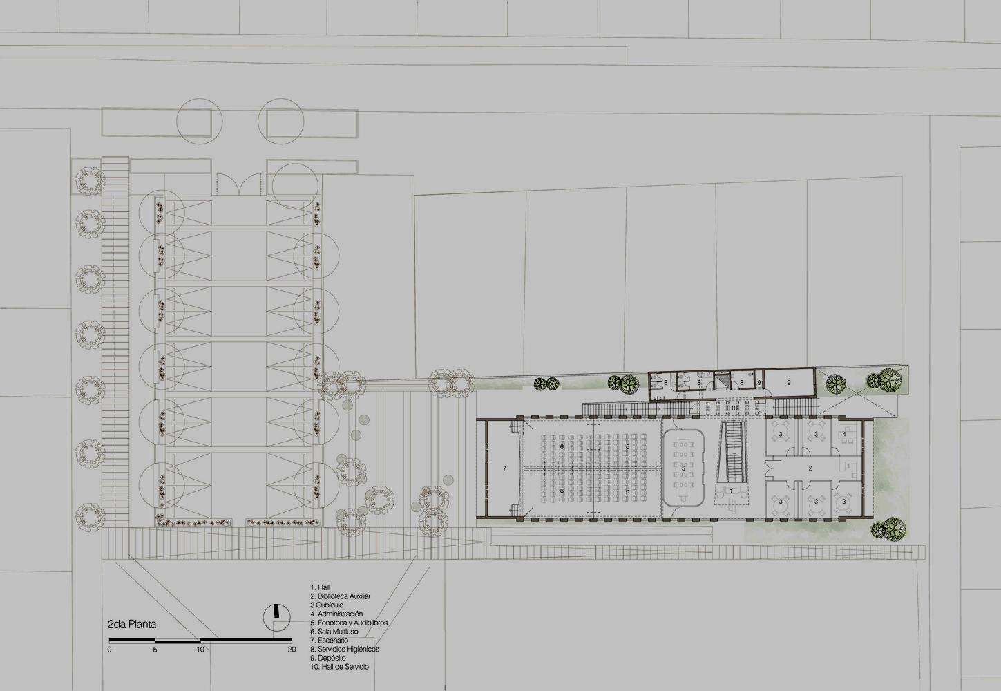 Zona administrativa, sala de lectura para niños, sala general, patio de lectura, y almacén general, sala de estudio, sala de cómputo, sala de lectura y almacén de libros