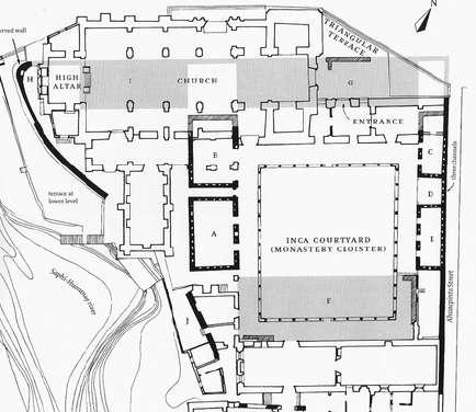 La Iglesia y el monasterio de Santo Domingo. Los Muros Incas del Coricancha, dibujando por Graziano Gastparina y Luise Margolies en 1974. El plano muestra los muros expuestos o construidos al estilo inca por restauradores.