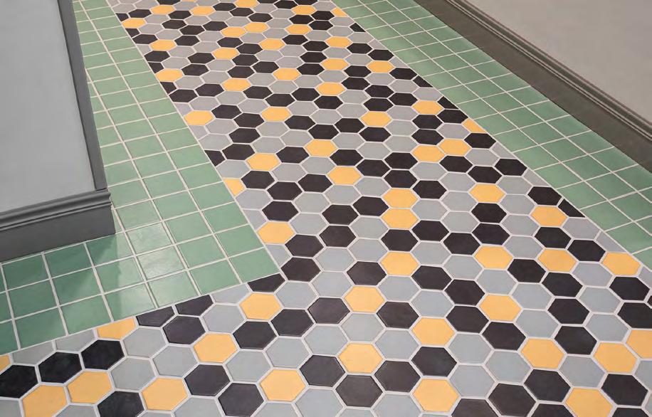 4x4 Original Ceramic in Clover; 4" Hexagon Original Ceramic in Pyrite, Basalt, and Sunflower