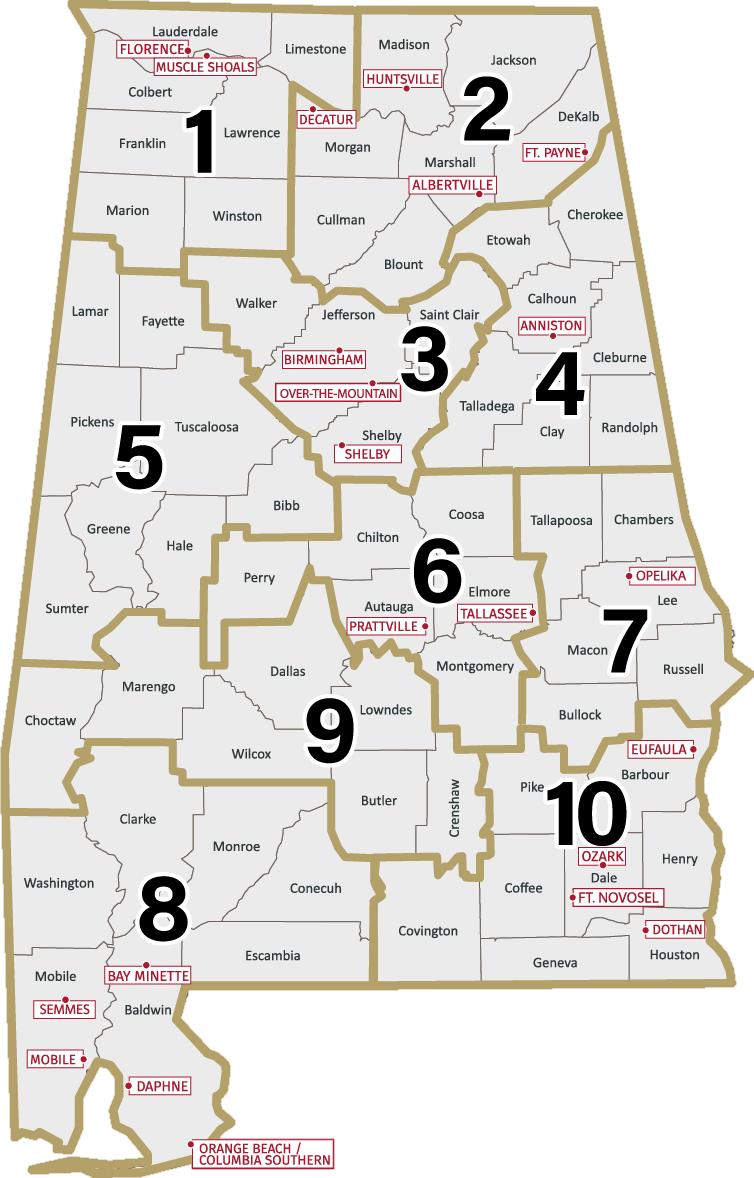 It’s our goal to extend training opportunities into every county in Alabama. To accomplish this objective, we have a network of regional coordinators to facilitate training at the local level The regional staff is available to answer questions, set up training, and respond to the needs of fire service across the state