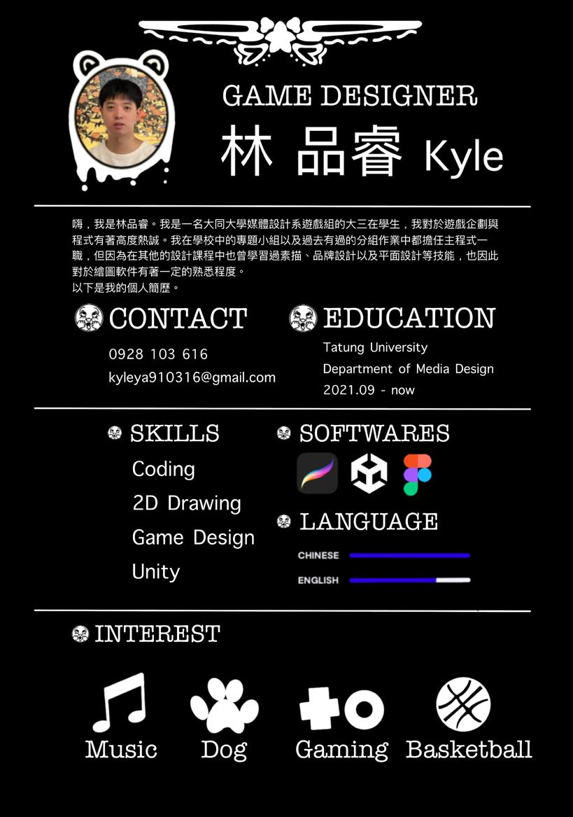 嗨,我是林品睿。我是一名大同大學媒體設計系遊 戲組的大三在學生,我對於遊戲企劃與程式有著高 度熱誠。我在學校中的專題小組以及過去有過的分 組作業中都擔任主程式一職,但因為在其他的設計 課程中也曾學習過素描、品牌設計以及平面設計等 技能,也因此對於繪圖軟件有著一定的熟悉程度。 KYLEYA910316@GMAIL.COM