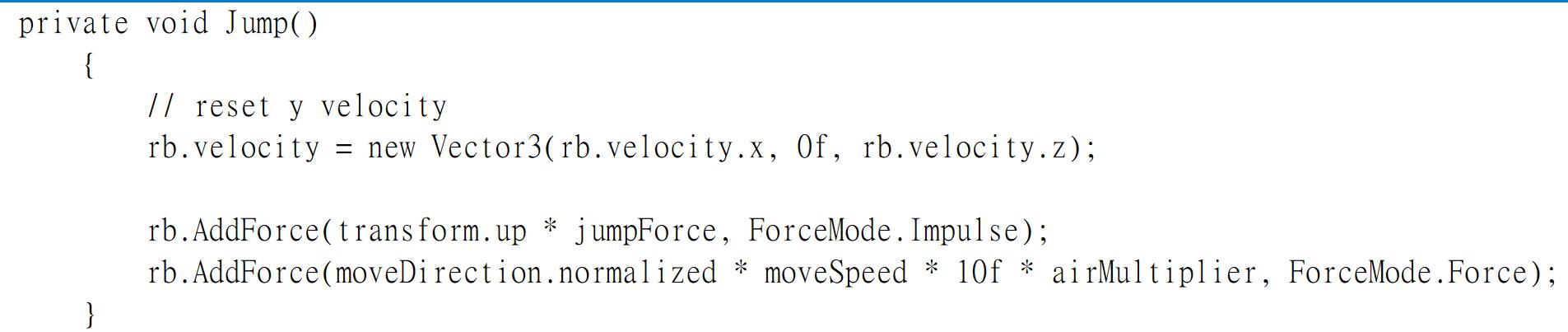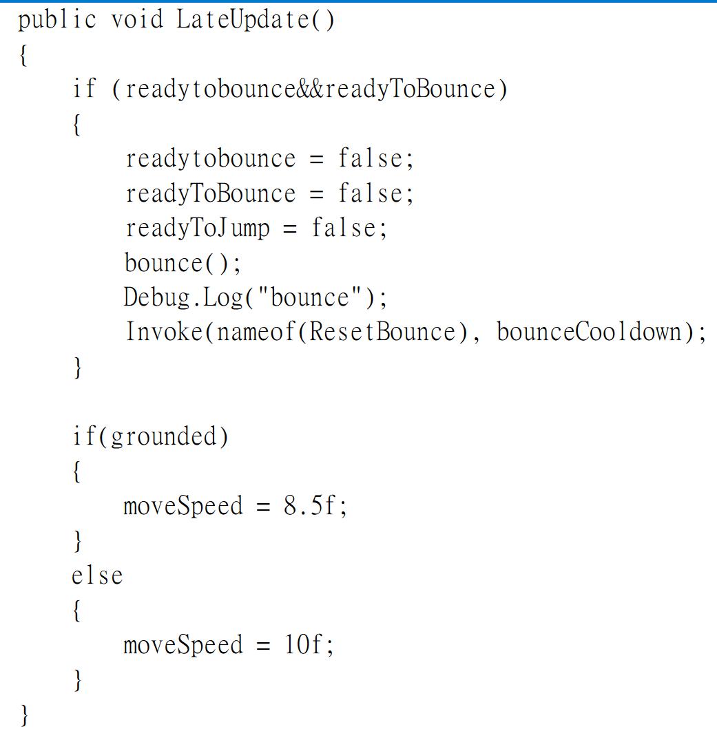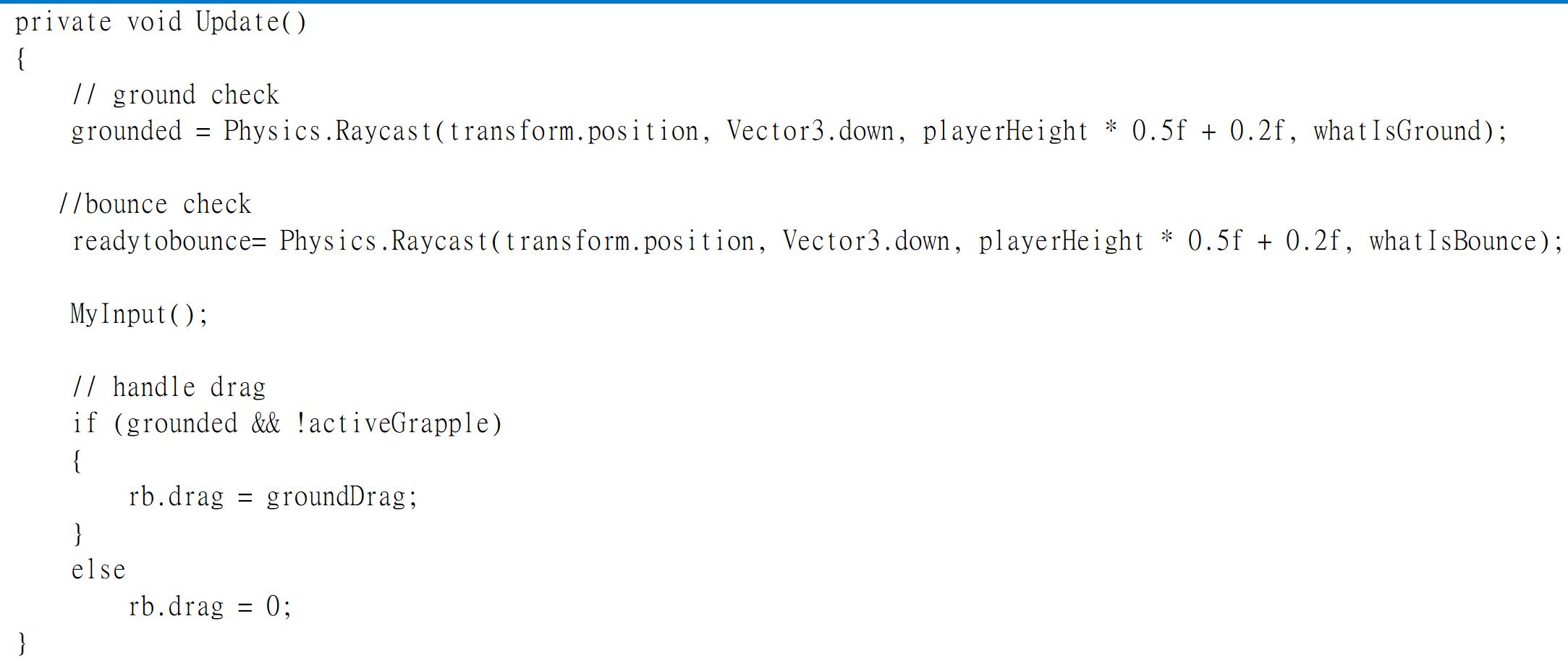 玩家是否按下了跳躍鍵以及偵測玩 家的狀態,例如是否接觸地面或者 是否達成可以彈跳的條件。在每一 次執行完Update() 之後便會執行 LateUpdate(),這段程式會處理剛剛 Update()判定完畢的狀態並且改變玩 家角色的速度值,或者在Update() 判定角色處於能夠彈跳的情況下觸碰 到跳墊時會向上跳躍。