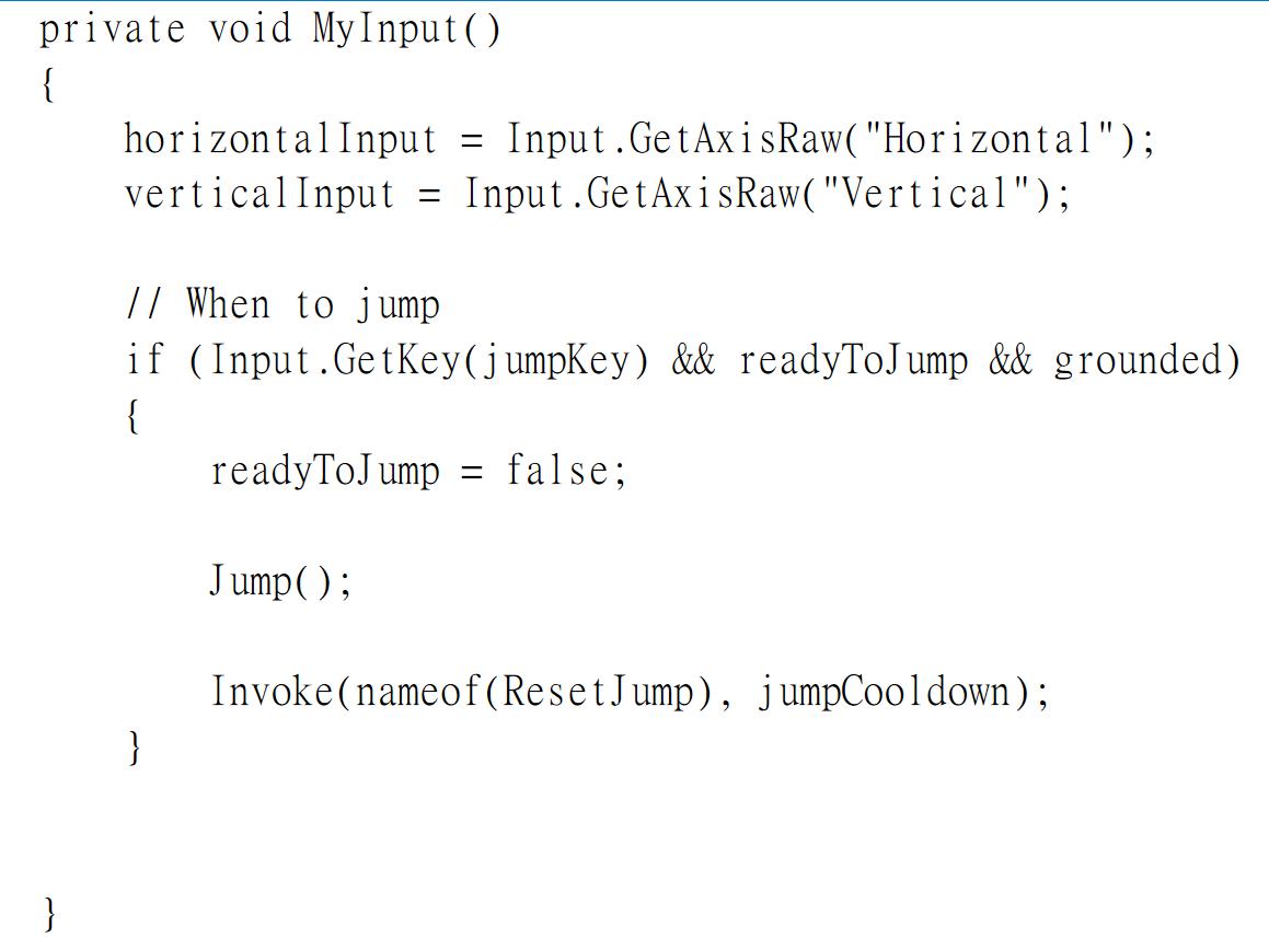 當白鍵按下時會判定角色現在的狀態是否符合跳躍的條件,若是符合便會執行 Jump()來進行跳躍動作,並且在一定的冷卻時間之後才能重新執行。