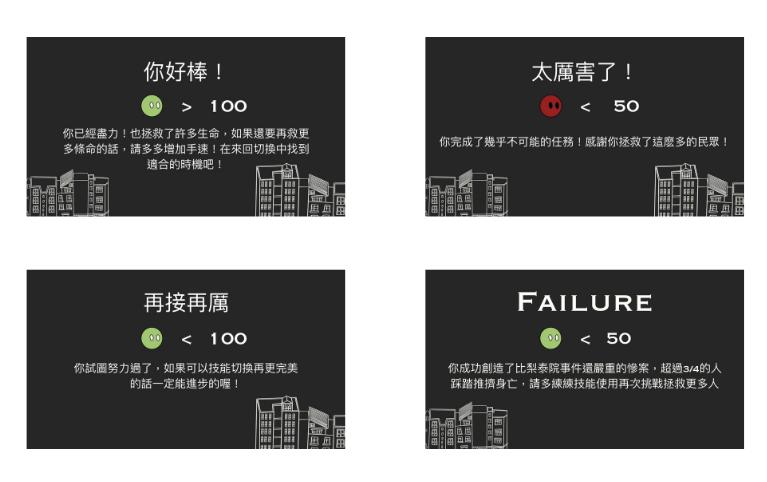 當出現過多紅點時,將會導致遊戲失敗,通關時也會根據遊戲中出現過的紅點數量 決定最後玩家的評分,並給予一到三顆星的評價。
