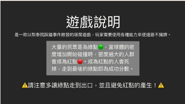 透過遊戲,我想讓玩家們知道為了避免悲劇的發生需要做對哪些事情以及體驗事件 發生時的人群密集程度。讓玩家從體驗過程中同時了解到兩個不同面向,受害者及疏 散人員的角度去更加全面的認識這起事件,從而學會如何有效避免相同的狀況便是我 的目的。