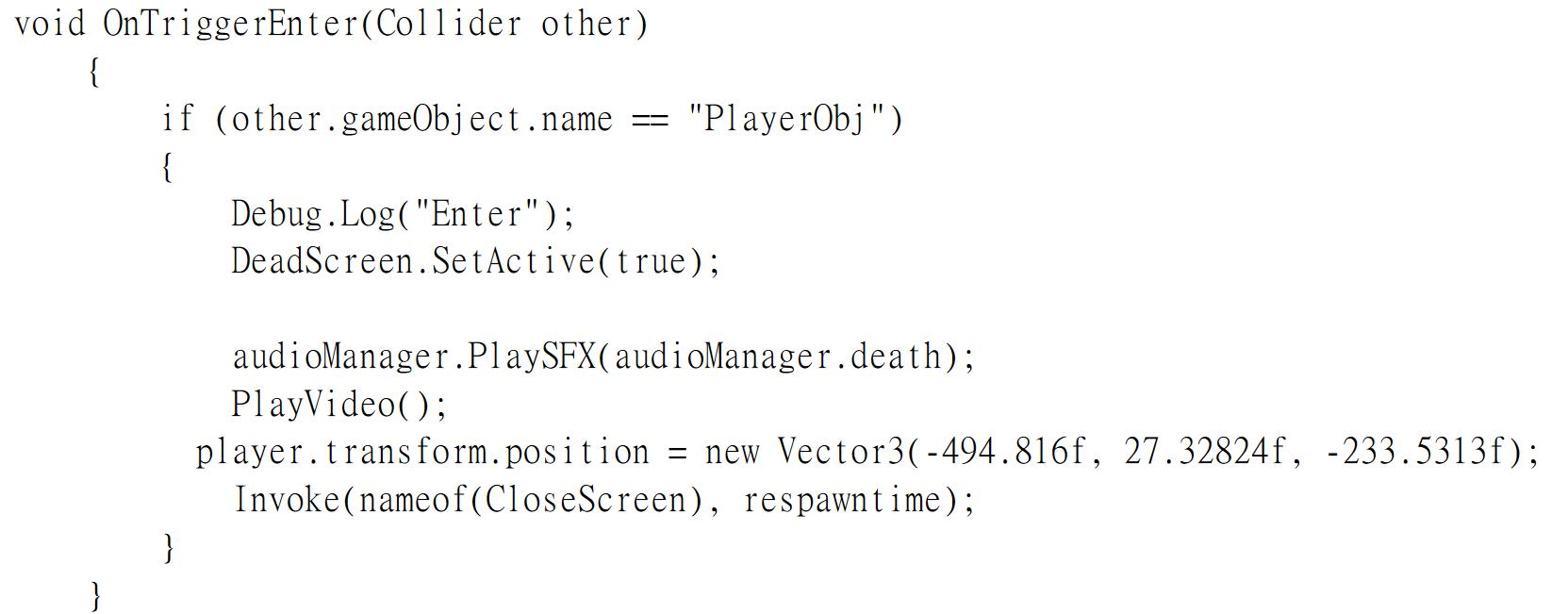 透過這段程式可以讓玩家的角色在死亡時撥放死亡動畫,並且將玩家傳送至上一個存 取點繼續遊戲。