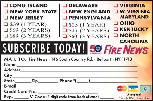 Letters to the Editor, byline articles, and columns represent the opinions of the writers and photographers and are not necessarily the views of the Fire News. We reserve the right to edit all of the above. We are not responsible for errors in advertisements beyond the cost of advertising space. Copy submitted is subject to editing for space requirements. The placing of an advertisement in this publication does not constitute endorsement. Contents are copyrighted. Editorial and advertising copy cannot be reproduced without written permission from the publisher. Fire News is published monthly by Fire News Inc, with corporate offices at 146 South Country Road, Bellport, NY11713.