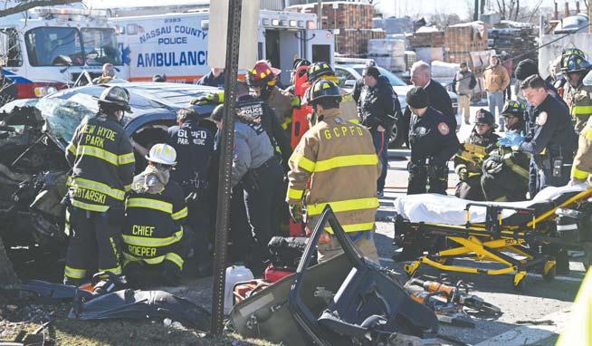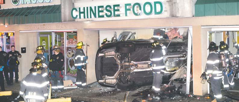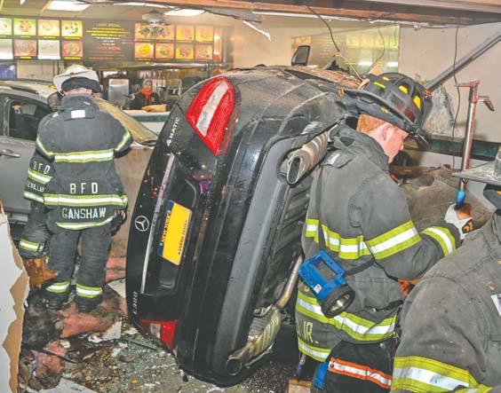 On the night of January 26, 2024, the Bethpage Fire Department was called to a carinto a building with fire at the intersection of North Broadway and Boundary Avenue. When firefighters arrived on scene, they were met with an SUVfully inside a Chinese restaurant and a sedan on its side and partially inside of the eatery. There was a small fire in one of the vehicles that was quickly extinguished, and the driverof the sedan was briefly trapped but immediately extricated. It was discovered that the SUVwas parked, unoccupied and hit by the sedan which was traveling northbound on North Broadway before leaving the roadway. Two people were transported to area hospitals and one person refused medical attention at the scene. None of the injuries were believed to be life-threatenin g and the accident was underinvestigation. All fire department units were underthe command of Bethpage Chief of Department Debobes.