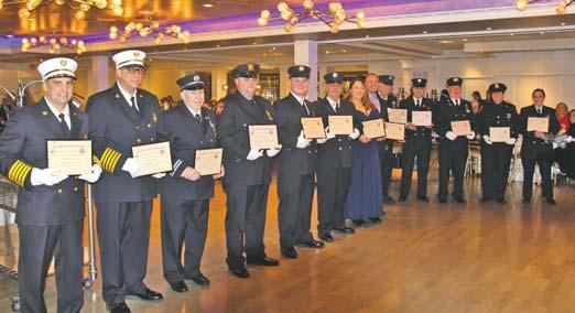 Pictured left to right, standing: First Lieutenant Tom Maiorano (Chemical & Rescue Co.1) 3 Pre-Hospital Saves; Captain Michael Palumbo (Chemical & Rescue Co.1) Unit Citation; Second Assistant Chief Jon Cutolo, Chief of Department David Collins (Hook Ladder & Engine Co. 2) Pre-Hospital Save; Village Trustee Doug Madlon, Village Mayor Mike Lavorata, First Assistant Chief Robert Santos, Third Assistant Chief David Brink, Ex-Chief Robert Pflug (Breslau Engine Co.1) Unit Citation; Ex-Chief James Gallagher (Breslau Engine Co.1) Unit Citation, Ex-Chief Michael DeGregorio (Hook Ladder & Engine Co. 2) Rescue Medal; Captain Ryan Kienle (Union Hook & Ladder Co.1) Honor and Awards Chairman.