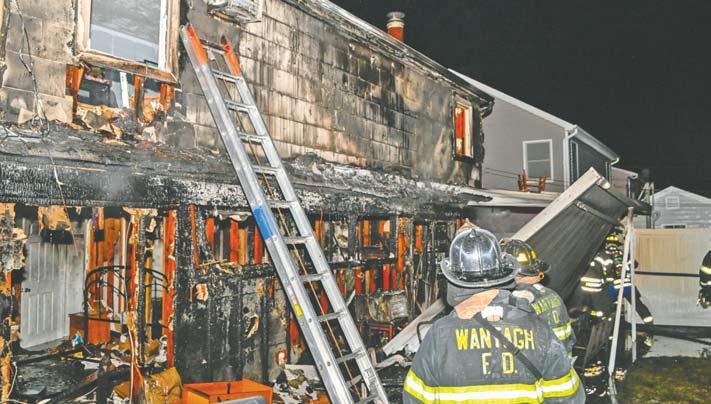 At 2353 on January 24, 2024, CenterMoriches firefighters were alerted to a house fire on Montauk Highway across from Bay Pointe Drive in Moriches. Firefighters arrived to find the two-story vacant building fully engulfed in flames and immediately called foradditional resources. While CenterMor iches worked to extinguish the heavy fire conditions on the first and second floors of the home, additional assistance was requested to the scene from East Moriches, Mastic, Brookhaven and Mastic Ambulance; Manorville covered. It took firefighters 90 minutes to bring the fire undercontrol. While there were no firefighterinjuries reported, Suffolk County Police Homicide Squad and Arson Section detectives were investigating the circumstances surrounding the death of a man whose body was found inside the vacant house. - Fire News photos by ex-Chief Bill Renzetti