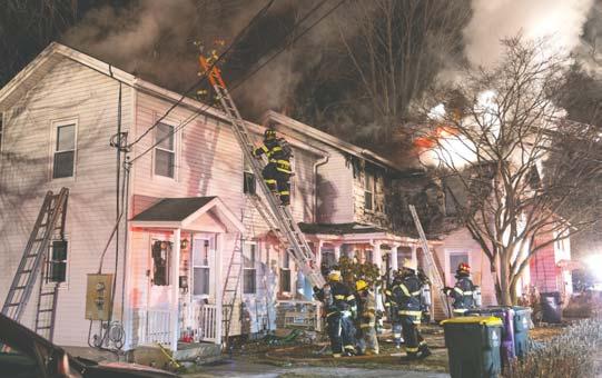 Lynn (MA) firefighters battled this three-alarm fire on Sachem Street on February 16, 2023. Heavy fire took control of the top floorand cockloft of this large three-story multi-dwelling. Afteran initial interiorattack, crews were remo ved in favorof a defensive posture. Multiple handlines and ladderpipes were deployed to knock down the fire.
