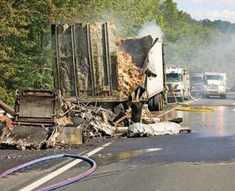 Crews arrived to find the truck consumed by fire and spreading into the trailer.