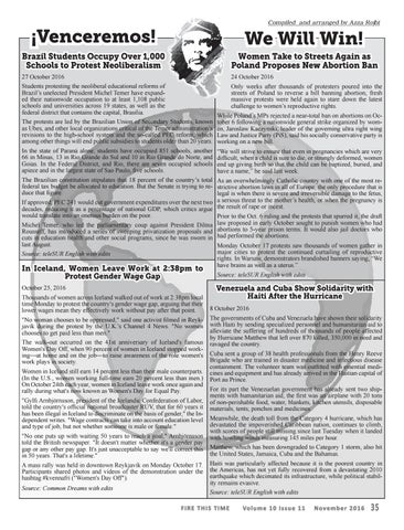 The Brazilian constitution stipulates that 18 percent of the country’s total As an overwhelmingly Catholic country with one of the most refederal tax budget be allocated to education. But the Senate is trying to re- strictive abortion laws in all of Europe, the only procedure that is duce that figure. legal is when there is severe and irreversible damage to the fetus, If approved, PEC 241 would cut government expenditures over the next two a serious threat to the mother’s health, or when the pregnancy is decades, reducing it as a percentage of national GDP, which critics argue the result of rape or incest. would translate into an onerous burden on the poor. Prior to the Oct. 6 ruling and the protests that spurred it, the draft Michel Temer, who led the parliamentary coup against President Dilma law proposed in early October sought to punish women who had Rousseff, has introduced a series of sweeping privatization proposals and abortions to 5-year prison terms. It would also jail doctors who cuts in education health and other social programs, since he was sworn in had performed the abortions. last August. Monday October 17 protests saw thousands of women gather in major cities to protest the continued curtailing of reproductive Source: teleSUR English with edits rights. In Warsaw, demonstrators brandished banners saying, “We have brains as well as a uterus.”