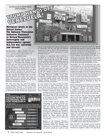 supporters. For 37 days, from April 10 – May 16 they held their ground in defense of the Vienna Convention, International law which governs the treatment of embassies and diplomatic missions. At times there were as many as 50 people inside of the Embassy, and hundreds more outside, as violent pro-war violent right-wing Venezuelans attempted to intimidate them into leaving using strobe lights, bull horns, sirens and a whole range of vile, racist, sexist and homophobic insults. Meanwhile, the U.S. government and police merely looked on or even perpetrated the assaults on peaceful activists who were attempting to deliver food or water to Embassy Protectors. This included the assault of Gerry Condon, President of Veterans for Peace, who was violently arrested by the U.S. Secret Service after attempting to deliver cucumbers into Embassy Protectors.