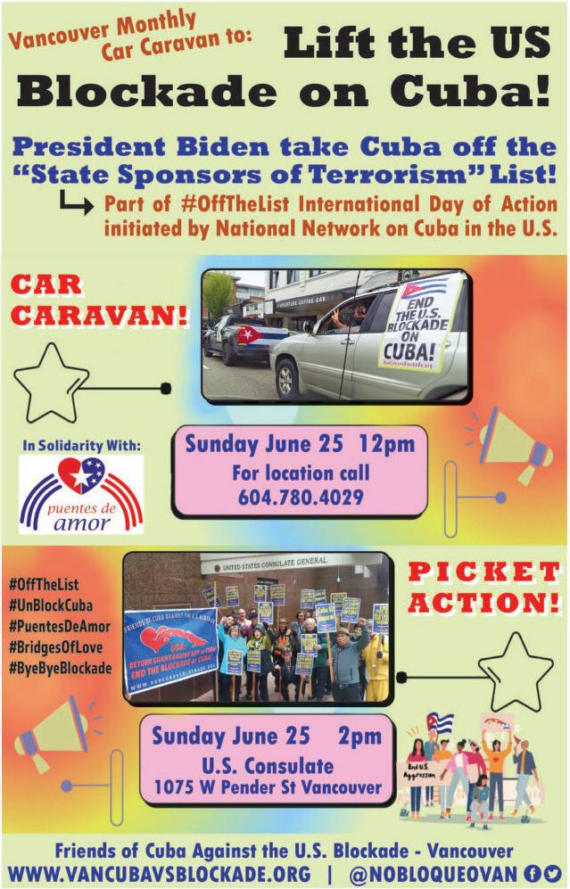 (NNOC) to call on U.S. President Biden to immediately remove Cuba from the State Sponsors of Terrorism list (SSOT). Vancouver joined this International Day of Action, and Friends of Cuba Against the U.S. Blockade-Vancouver held its monthly Car Caravan followed by a picket action at the U.S. Consulate in Downtown Vancouver. The monthly Car Caravan against the U.S. blockade is a campaign started by Cuban American activist Carlos Lazo and the Puentes de Amor (Bridges of Love) organization from Miami, Florida, in the early days of the pandemic, as a way to keep protesting the U.S. blockade while keeping social distance. The campaign continues in Miami and many other cities and is held monthly in Vancouver. The June 25 Car Caravan in Vancouver was a sight to see, as cars decorated with Cuban flags and signs demanding “Lift the U.S. blockade on Cuba!” caravanned through the streets to downtown Vancouver and pulled up together in front of the U.S. Consulate. The protesters then continued the protest, with picket signs and banners, chanting and picketing with the demand to take Cuba off the SSOT list now!