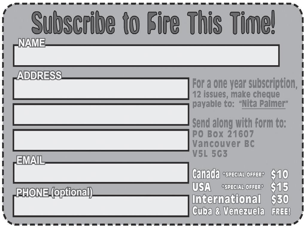 Fire This Time Newspaper is written, produced and distributed entirely by volunteer labour and printed in Burnaby, Greater Vancouver, Canada ISSN-1712-1817