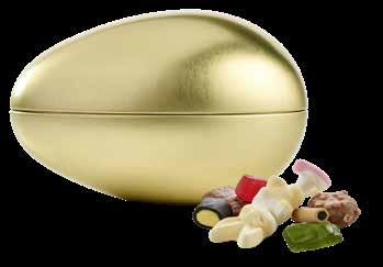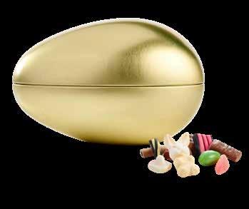 Gullegg i metall fylt med sjokolade, påskeskum, lakris, vingummi og dragerte egg.