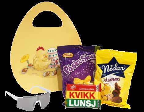 En koselig påskepose fylt med populære påskefavoritter og hvite raske briller. Inneholder Cloetta Påskeskum, Nidar Påskemiks og Kvikk Lunsj.