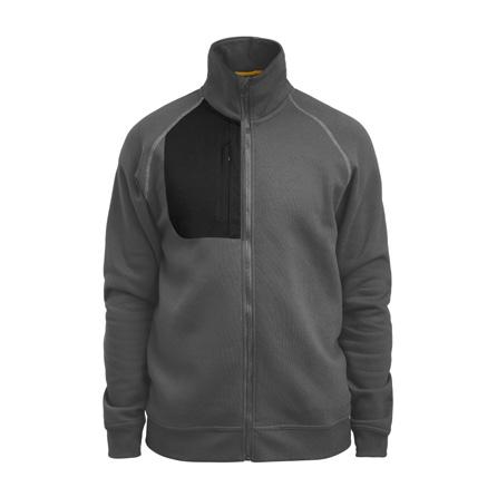 Genser laget av French Terry (med små løkker på innsiden). Formsydd, dobbel krage med 2x2 ribb på innsiden. Slett mansjett i nederkant, 2x2 ribb i mansjetter på ermene. Synlige YYK-glidelåser med detaljer i antikk sølvmetallfarge, hel glidelås i front og glidelåser i frontlommene. Ton-i-ton dekorsømmer i overlock.